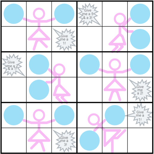 Cheerleaders: In every outlined 2x3 box there are two non pom-pom cells with pink line drawings that represent a cheerleader. Cheerleaders must contain the numbers that they are requesting in their respective cheers.