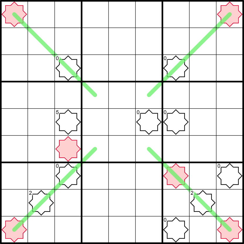 - Diagonal Stars: A digit in a red star sees another N copies of itself diagonally, where N is the digit itself. (For example, a 1 in a red star sees one other 1 diagonally, while a 4 in a red star sees four other 4s.)