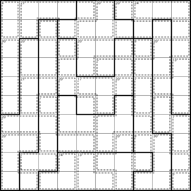 Platzieren Sie die Ziffern 0-9 in jeder Zeile, jeder Spalte und in jeder Region. Die Summe der Ziffern in einem Killerkäfig muss ohne Wiederholung die angegebene Summe ergeben.