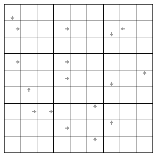 Normal sudoku rules apply. The sum of the digit N in a cell with an arrow and the digit N cells away in the direction of the arrow is 4 or 13.