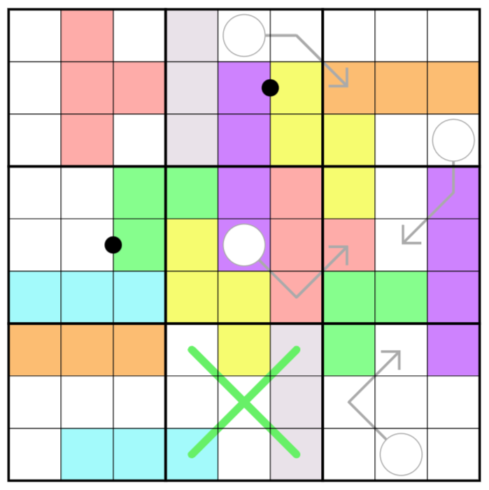 There are 7 pairs of clone regions in the puzzle. Cells in the same relative position of a clone pair contain the same digit. Digits may repeat in a region if allowed by other rules.