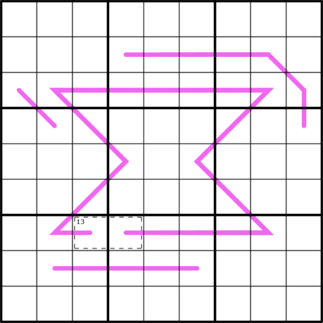 Purple lines: A purple line of length up to, and including, 5 is a renban. The digits along the line must be a non-repeating set of consecutive digits in any order. A longer purple line is a run-on renban; every group of 5 sequential cells along the line is a 5 cell renban. That is, it forms a set of overlapping renbans.