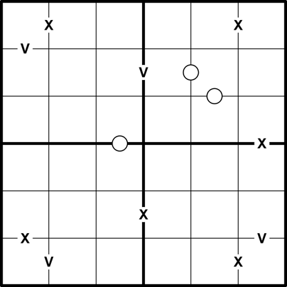 XV (Negative Constraint): Cells separated by an 'X' must sum to 10. Cells separated by a 'V' must sum to 5. All possible Xs and Vs are given.