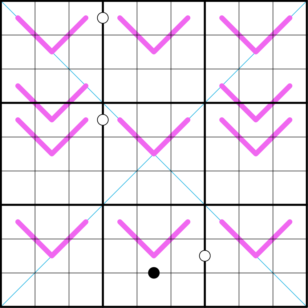 - Identical digits may not repeat in that same position within any two 3x3 boxes.