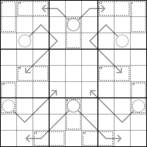Arrows: Digits along an arrow must sum to the number indicated in the circle from which the arrow emerges. Digits may repeat along arrows if allowed by other rules.