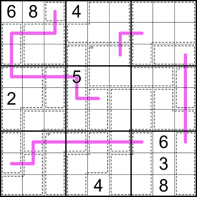 • For groups of cages connected by a purple line, cage sums form a consecutive set of numbers in any order