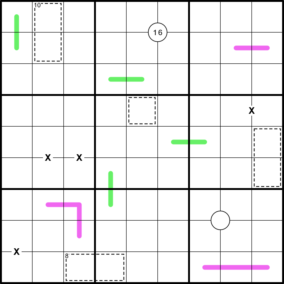 Constraint Regions: Each constraint type may contain no repeated digits anywhere in the puzzle. E.g. ALL cells connected by an X must contain no repeated digits, ALL cells around quad clues must contain no repeated digits etc.