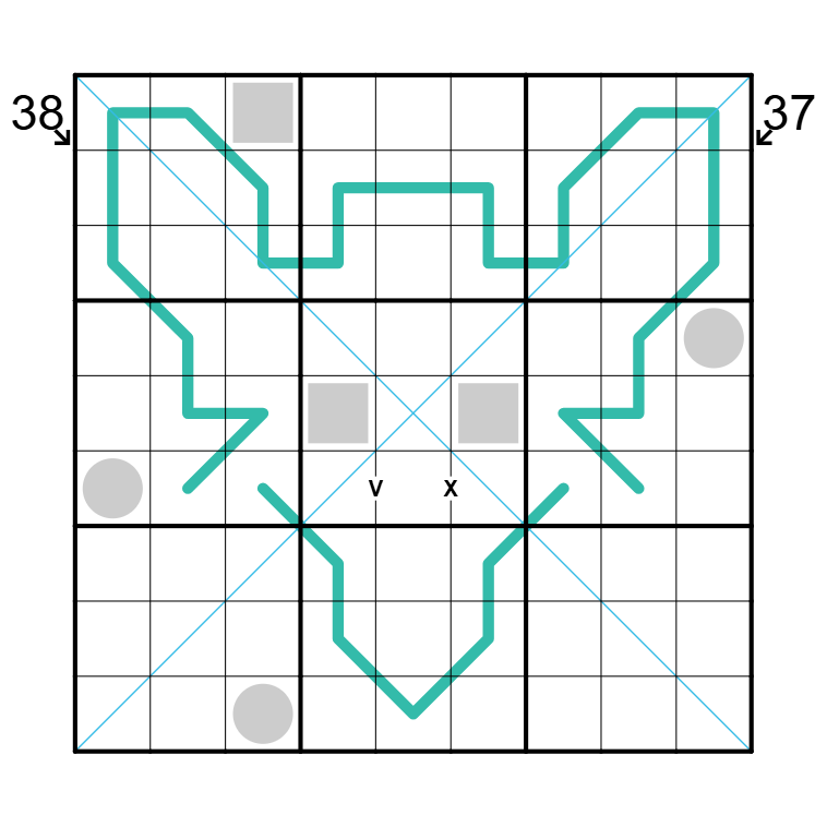 - Modular Line: Any run of three digits along a teal modular line must have a different remainder divided by 3, i.e. one from (1,4,7), one from (2,5,8), one from (3,6,9)