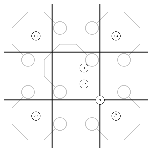 Quadruples: Digits in a Quadruple circle must be placed at least once in the four cells touching that circle.