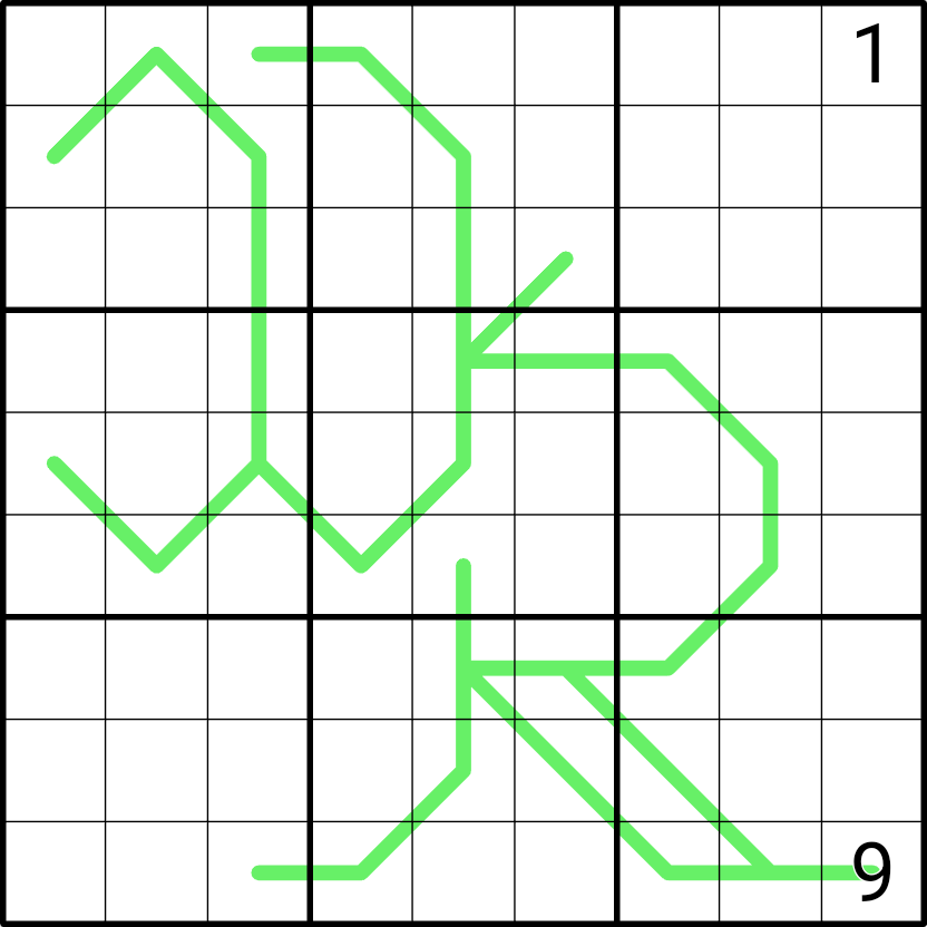 • German Whispers: Adjacent digits on a green line must have a difference of at least 5.