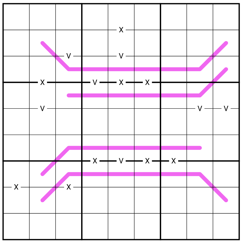 XV PAIRS: Cells separated by a "X" must sum to 10, and cells separated by a "V" must sum to 5. ALL XV pairs are given. There is a negative constraint on both the X and V pairs in this puzzle.