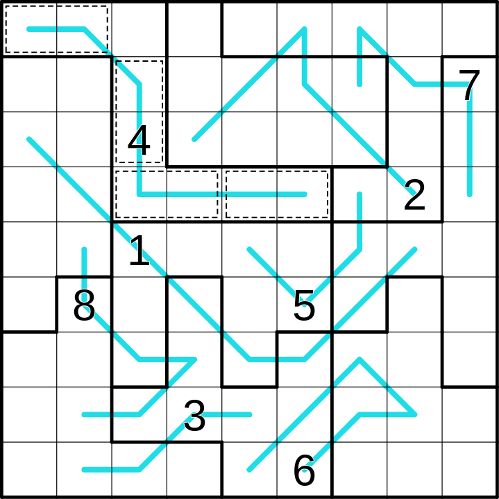 Place the digits 1-9 in each row, column, and marked region.