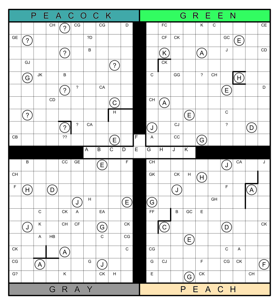 Just a note, there seems to be some discrepancies between Sgt. Gray's individual grid and the main grid. There seems to be an extra border given which was not given in the original, and there seems to be a cage clue (R6C3) which is GK instead of K. I believe that GK as the clue makes the puzzle unsolvable so I went with what was on the main grid.