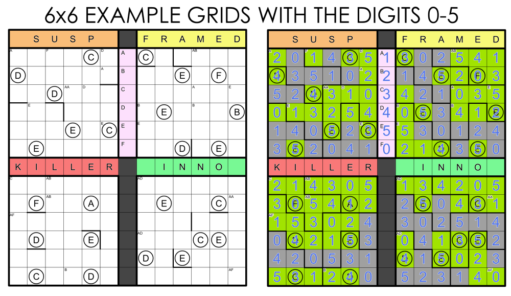 Cipher: Clues are ciphered where each letter represents a unique digit 0–9. Cipher is the same across all grids. A