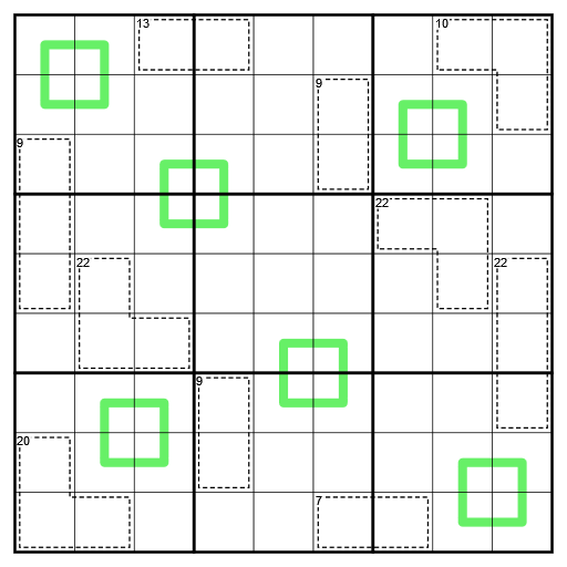 - Killer-Käfige: Ziffern in einem Käfig ergeben in der Summe den oben links angegebenen Wert.