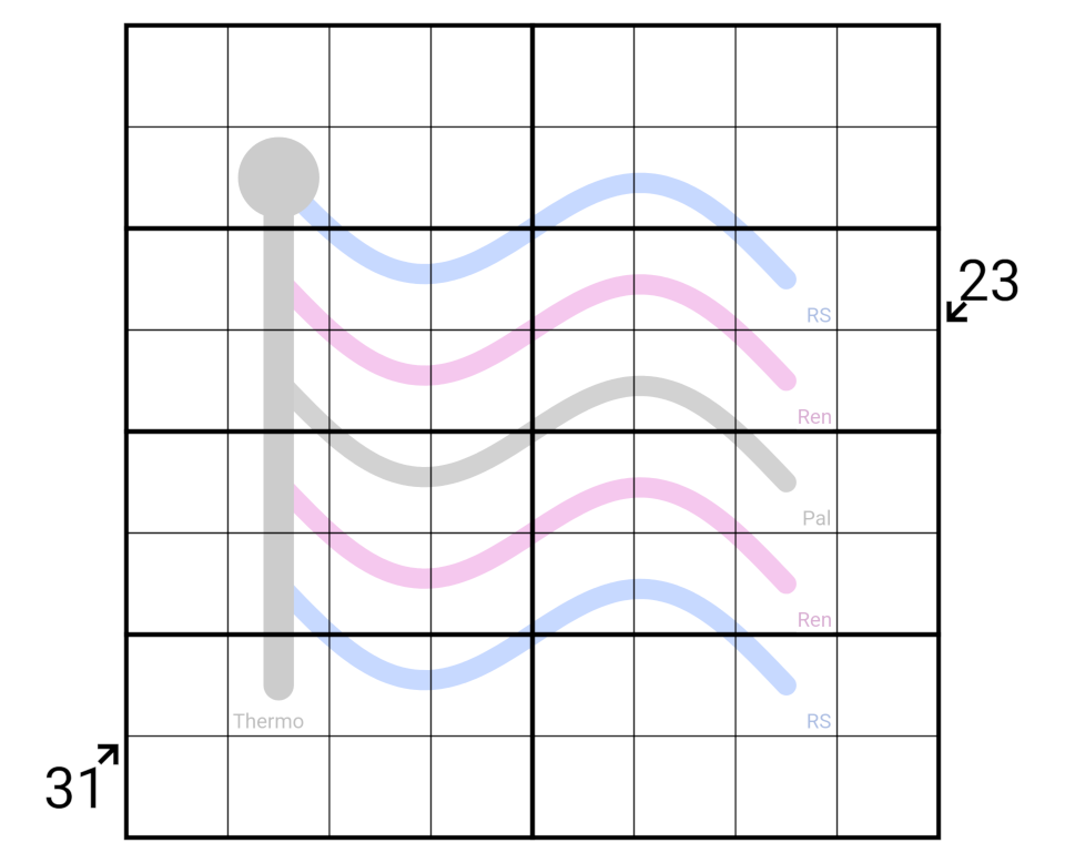 - Region Sum Lines: The sum of the digits on a region sum line within a 2x4 box must be the same for all of the 2x4 boxes the line passes through. For example one blue line might be 5|14|23|5 and the other might be 6|51|15|6.
