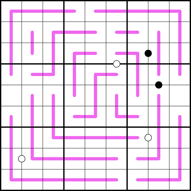 - Kropki : Numbers that appear in the cells with a white dot between must be consecutive. Numbers that appear in the cells with a black dot between must have a ratio of 2:1.