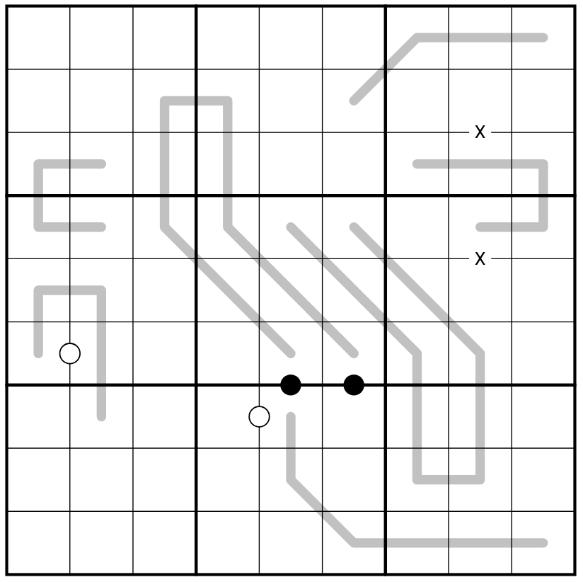 X-Pairs. Cells separated by a "X" must sum to 10. Not all X-pairs are given.