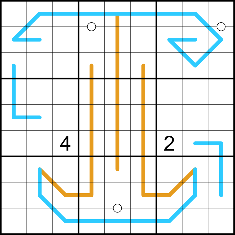 Hit lines (orange): The value of a hit line is the sum of all the digits on the line whose position counted from the start is the same as their value. For example if a 4 cell hit line had the digits 1364 on it, its sum would be 1 + 4 = 5. The first cell of a hit line is the cell touching a region sum line. The sum of a hit line must be the same as the sum of the region sum line segment it is touching.