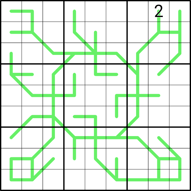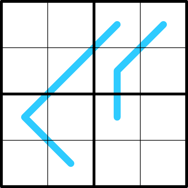Normal 4x4 sudoku rules apply. For each line, Digits on a line have an equal sum N within each box it passes through. Every visit to a region counts to a new total.