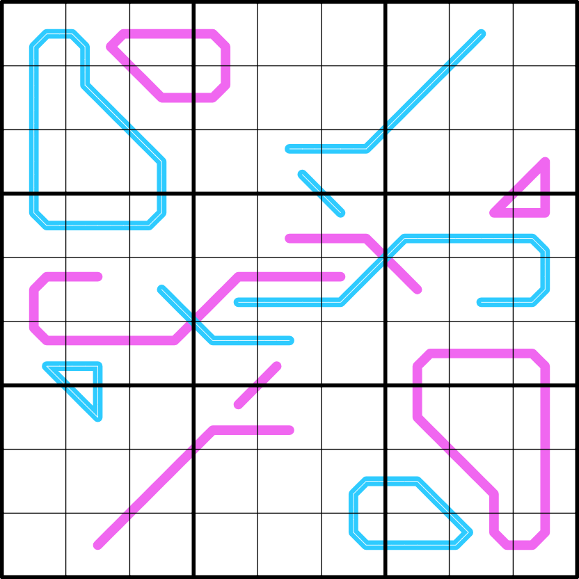 Region Sum (blue with streak): Digits on a region sum line have the same sum in each 3x3 box the line is in.