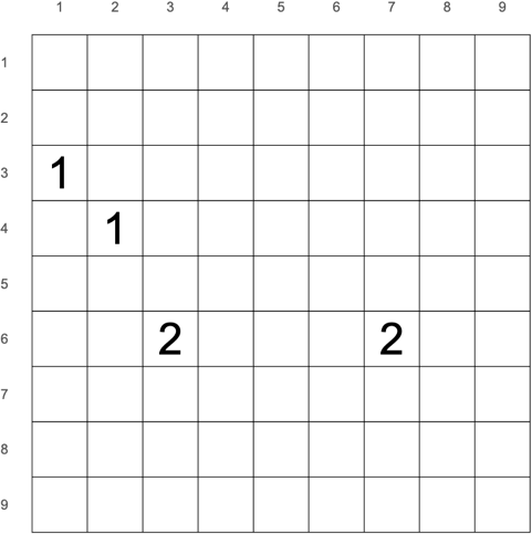 Fillomino. Divide the grid into regions of between 1 and 9 cells and fill each region with the number of cells it contains (eg: fill all 7 cell regions with seven 7s, etc).