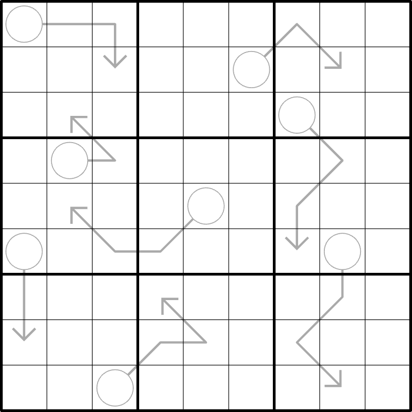 Extra Region Construction: There are nine, 9-cell orthogonally connected extra regions in the grid you must construct, where each digit from 1-9 must appear in each extra region.