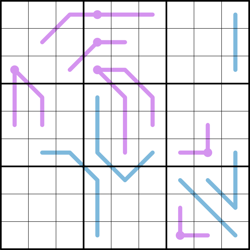 On purple lines, digits an equal distance from the center of the line must sum to the digit at the center. The center of the line is marked with a dot.