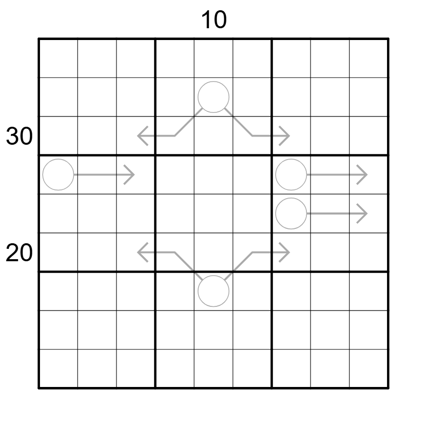 • Clues outside the grid show the sum of the digits between 1 and 9 in that row or column.