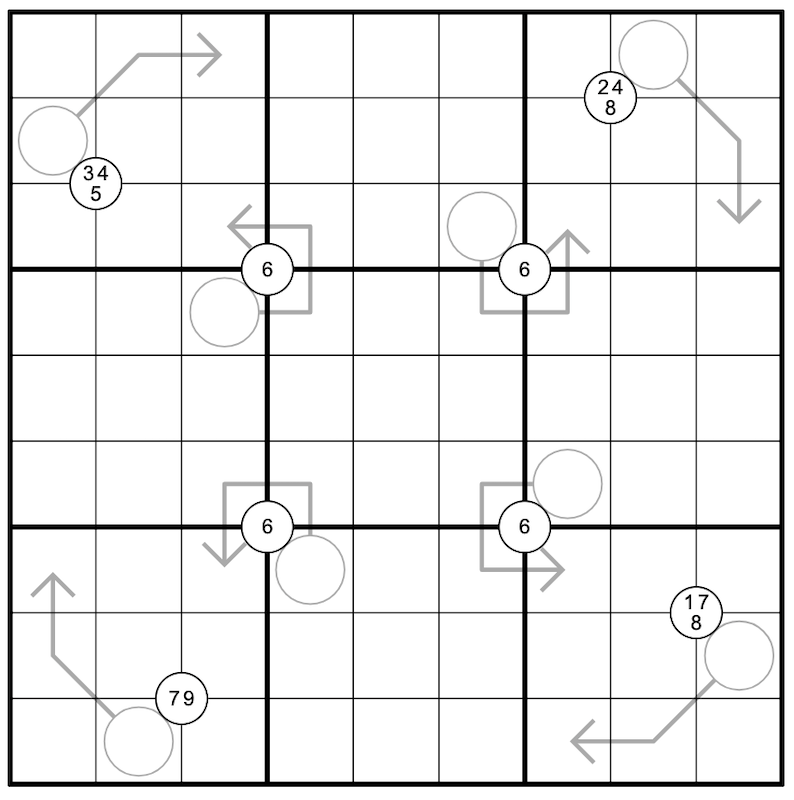 Digits on any arrow emerging from a circle sum to the digit in the circle, whereby digits may repeat along the arrow.