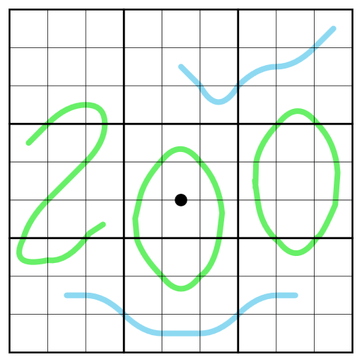 - 200-Linien: Jede blaue Linie (oben rechts und unten) wird von den Box-Grenzen in Segmente unterteilt, sodass das Produkt ihrer Segmentsummen genau 200 ergibt. Zum Beispiel könnte eine gültige Linie 26-7891 lauten, da (2+6)x(7+8+9+1)=8x25=200.