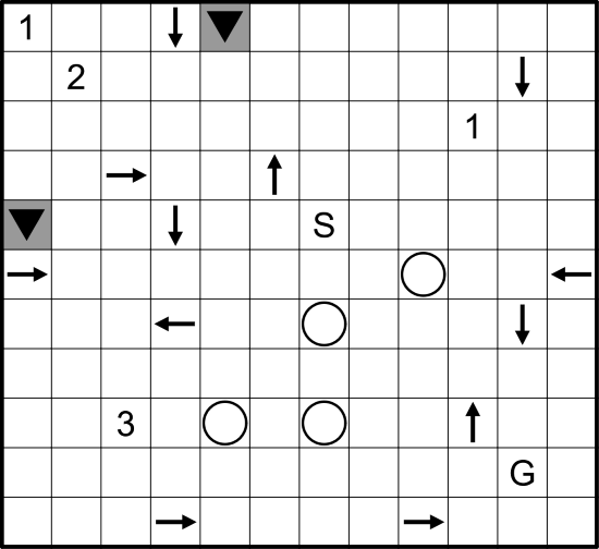 Building Walk: Draw a non-intersecting path through the centers of some cells, starting from the S (start), traveling through every number and shaded cell (elevator) in the grid, and finishing at the G (goal). The path has a floor number, which changes as it visits shaded cells (elevators). When it travels over an elevator with an up triangle, this number can increase by any amount (at least 1). When it travels over an elevator with a down triangle, it can decrease by any amount (at least 1). When it travels over a shaded cell (elevator) without a triangle, the number can increase or decrease by any amount, but cannot remain the same. The floor number cannot go below 1 or above the highest number in the grid. A number may only be visited when the path is on the corresponding floor.