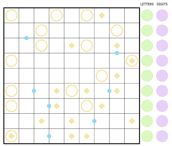 Using these letters, the answer to each cryptic clue below can be placed into the grid in a straight line, reading from left to right or downwards. Each peach circle marks the start of at least one word, and each peach diamond marks the end of at least one word. Every word starts at a circle and ends at a diamond. Different words can not share more than one cell.