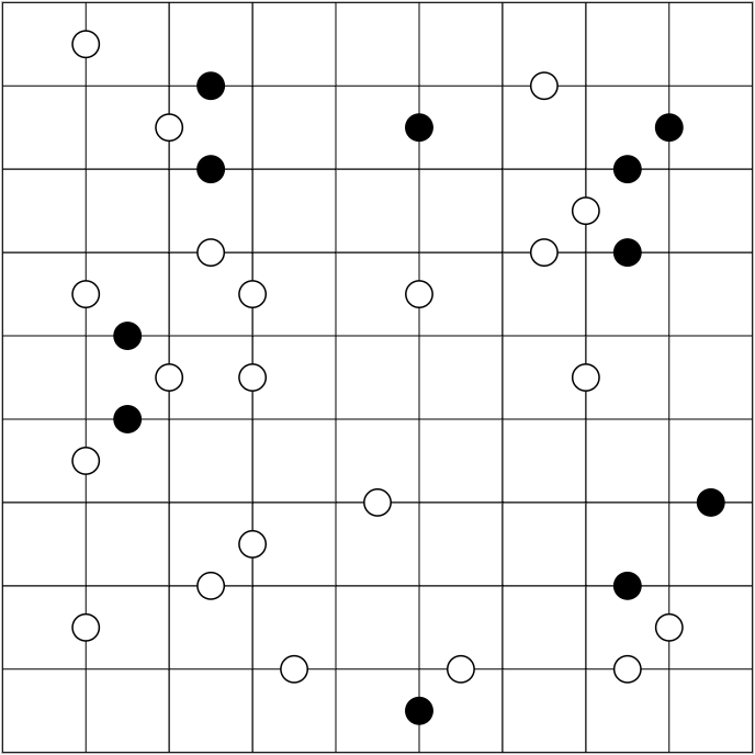 All dots are on region borders. (The two cells connected by a dot are in different regions.)