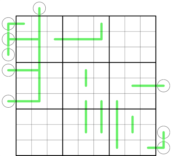 Adjacent digits on a green line must differ by at least 3 and any digit greater than 3 on a green line must be shaded (excluding circles).