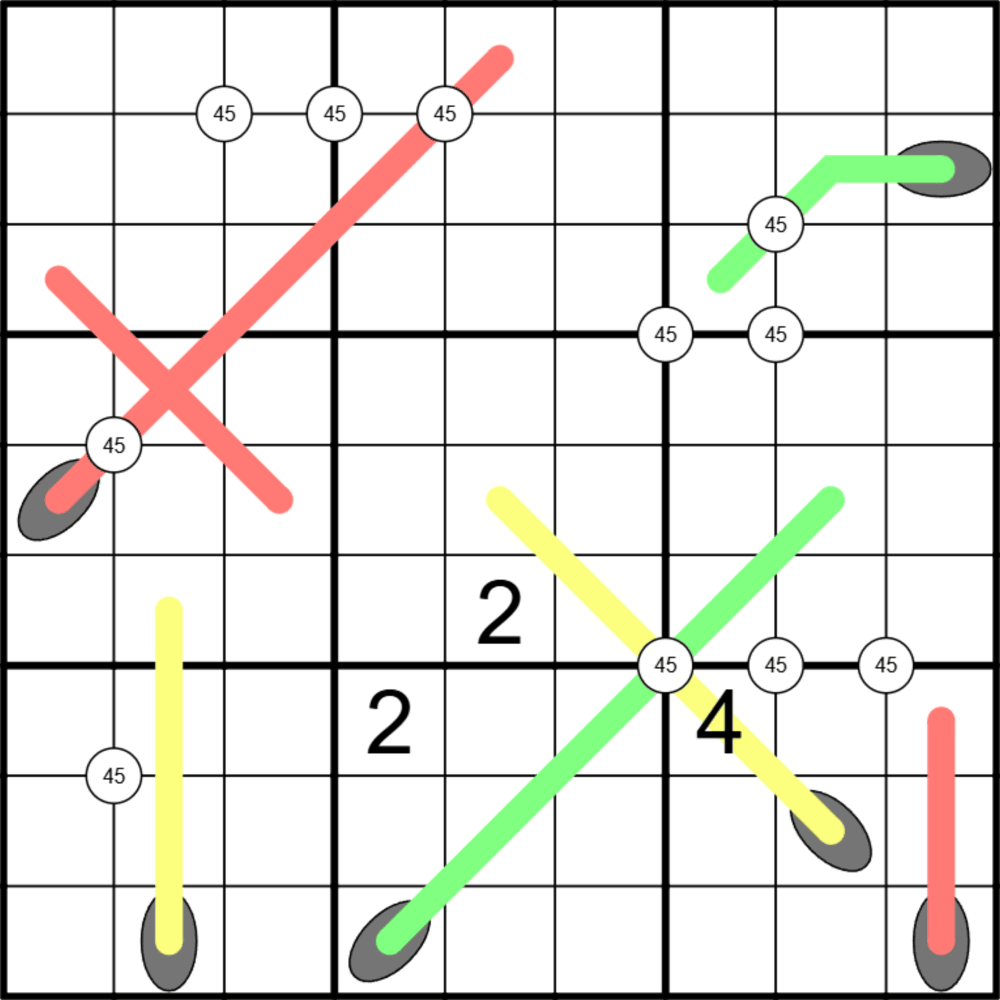 45 circles The digits 4 and 5 have to appear in at least one of the adjacent cells of every circle marked with 45.