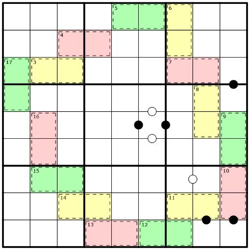 Felder, die mit einem weißen Punkt verbunden sind, haben eine Differenz von 1. Felder, die mit einem schwarzen Punkt verbunden sind, haben ein Verhältnis von 1:2. Nicht alle möglichen Punkte sind gegeben.