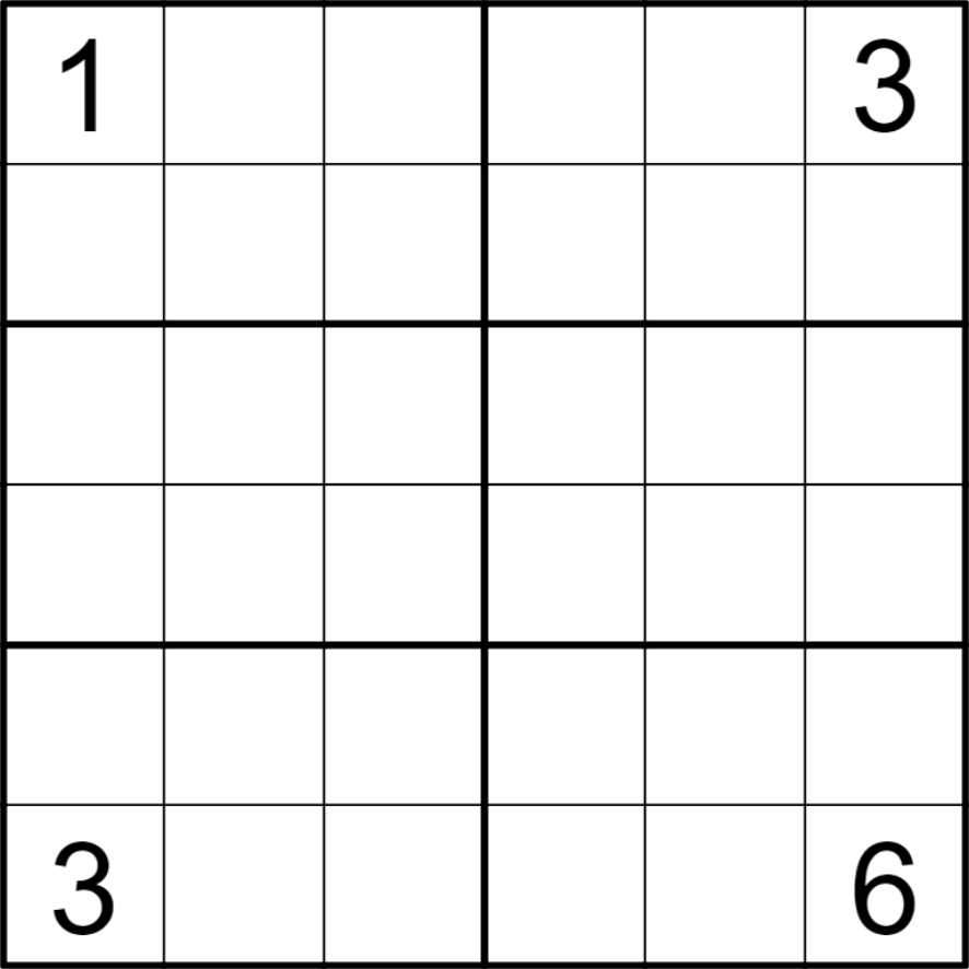Normal 6x6 sudoku rules apply. Place the digits 1-6 once in every row, column and bold outlined region.