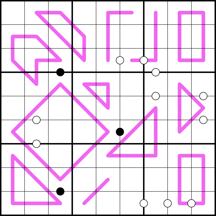 - Kropki dots: Cells separated by a white dot have consecutive values. Cells separated by a black dot have values in a 1:2 ratio.