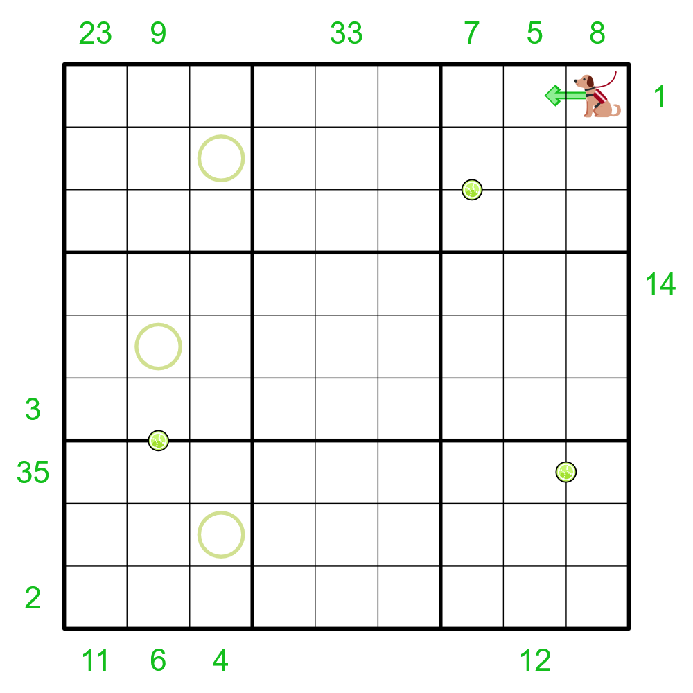 - The loop "starts" at the cell marked with the dog and is considered to be oriented in the direction indicated by the arrow (i.e. r1c9 and r1c8 are in the loop).