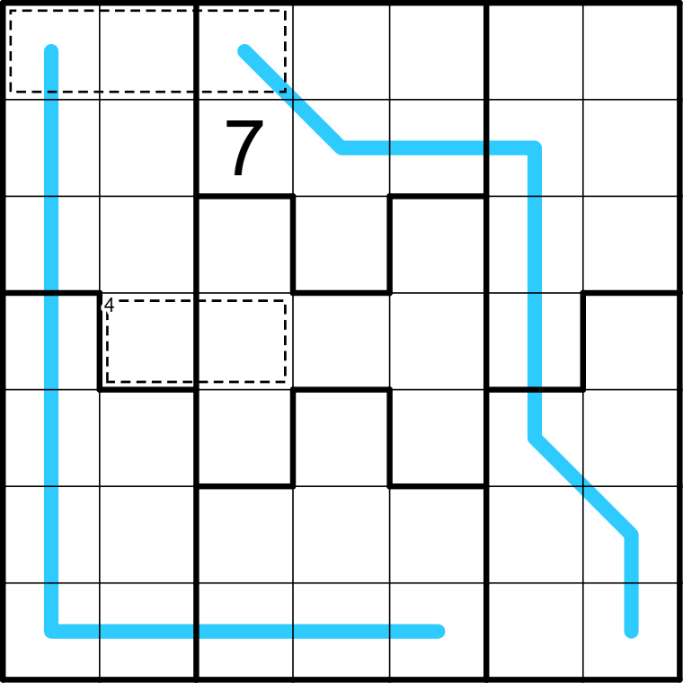 Killer cages: Digits in cages sum to the total in the top left hand corner if given. If no total is given, cages sum to the segment sum of the region sum line going through them.