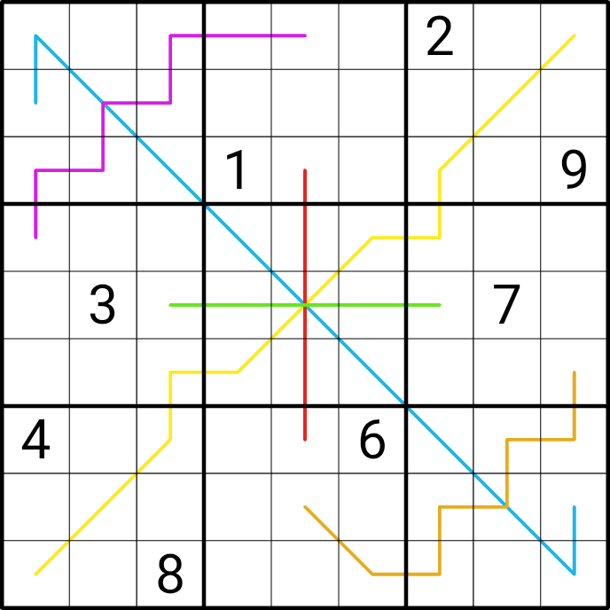 Lines are distinctly colored to indicate when separate lines cross. (Lines cross in the center cell of boxes 1, 5, and 9.)