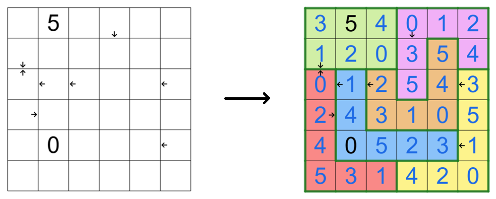 Below is a 6x6 example puzzle (using the digits 0 to 5) to help illustrate the rules. You can play the example puzzle on SudokuPad here.