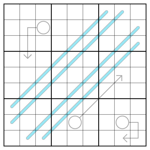 Region Sum-Linien: Boxgrenzen teilen blaue Linien in Segmente auf. Die Summen der Ziffern auf jedem Segment einer Linie müssen gleich sein.