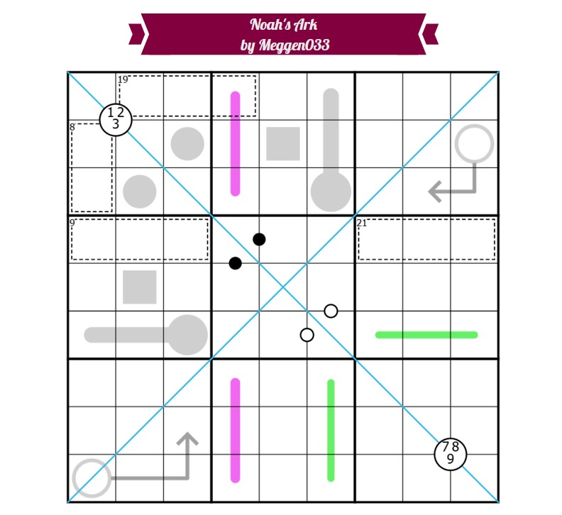 The variants in this puzzle come two by two, except for the cages where we need to keep all these rascally creatures. This is the next puzzle in what I'm going to call my “Kitchen Sink” series, where I throw in a little bit of everything. Check out my previous puzzles where I did just that: