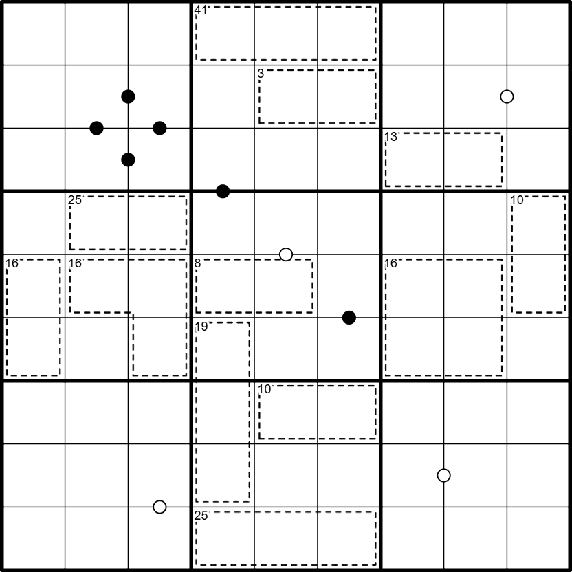 Killer cages: Digits in cages may not repeat and cell VALUES must sum to the number in the top-left corner.