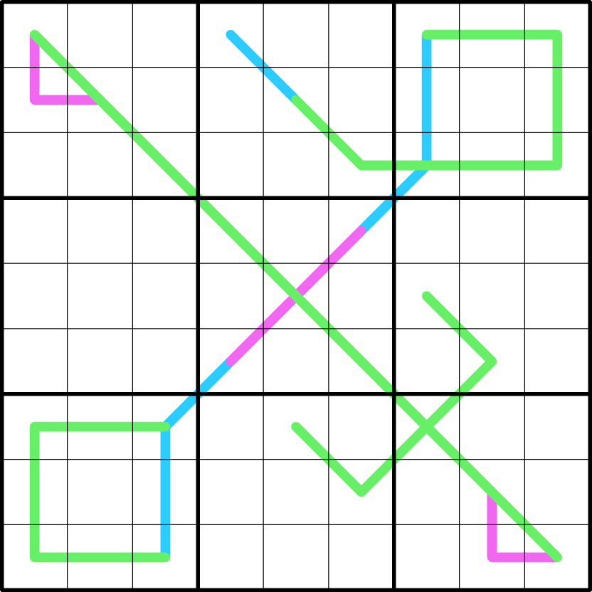 Green lines are in the foreground; pink lines come second: they might extend under green lines; blue lines are in the background: they might extend under pink and green lines.