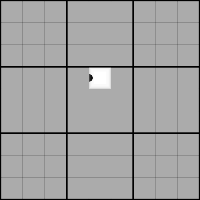 • Three in the Corner/Three in the Spotlight: Every 3×3 box must have a 3 in one of its four corners, or in its centre.