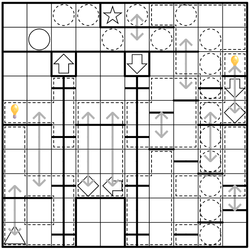 5. Ladders: Ladders shown by grey arrows can be used to go up or down. Moving up or down a ladder is not free; it costs a movement like any other movement. Ladders act also as a thermometer if they are used. The bulb is then the location you enter the first time when you use the ladder and the tip is the end of the ladder (upward or downward). Afterwards, You can only use ladders in the direction of the thermometer created from the bulb to the tip.