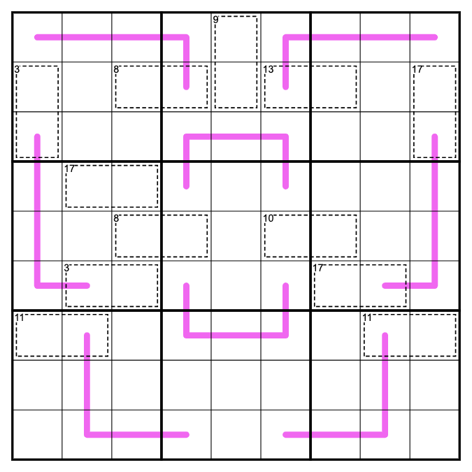 Cages: Digits in cages cannot repeat and must sum to the value shown in the upper left corner of the cage.